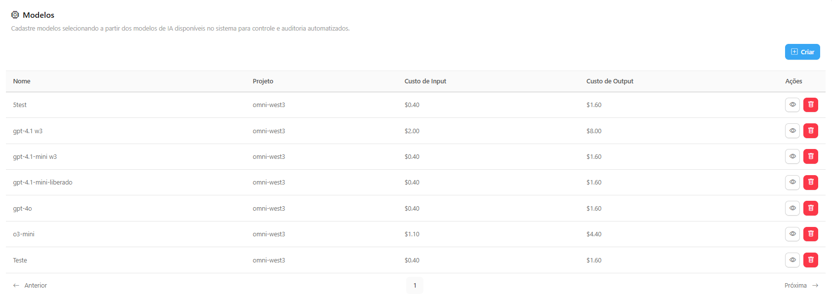 | **Modelos de IA** | Selecione na lista suspensa o modelo de IA que você deseja cadastrar.                                                                  |