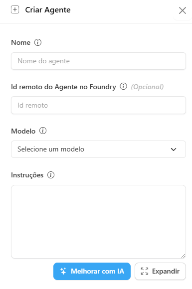 Clique no botão Criar Agente para abrir o formulário lateral (ou clique em editar para modificar um Agente existente).