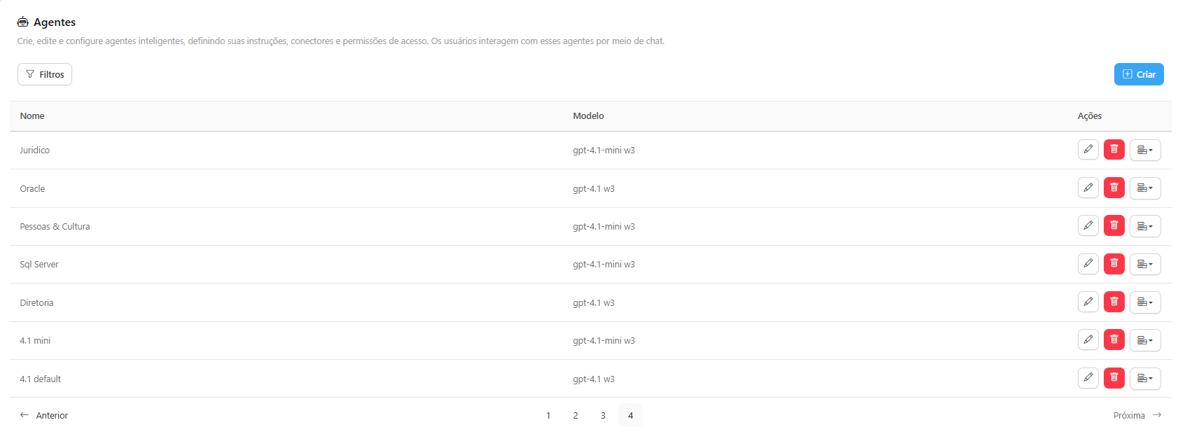 Ao finalizar o preenchimento, clique em Salvar. O novo Agente aparecerá na lista e estará pronto para ser usado pelos usuários autorizados.