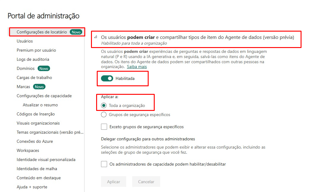 Fabric Data Agent tenant settings enabled.