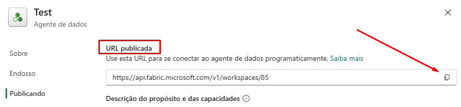 Paste the URL copied from Fabric into the Fabric Data Agent URL field. The system will automatically identify the Workspace ID and Artifact ID.