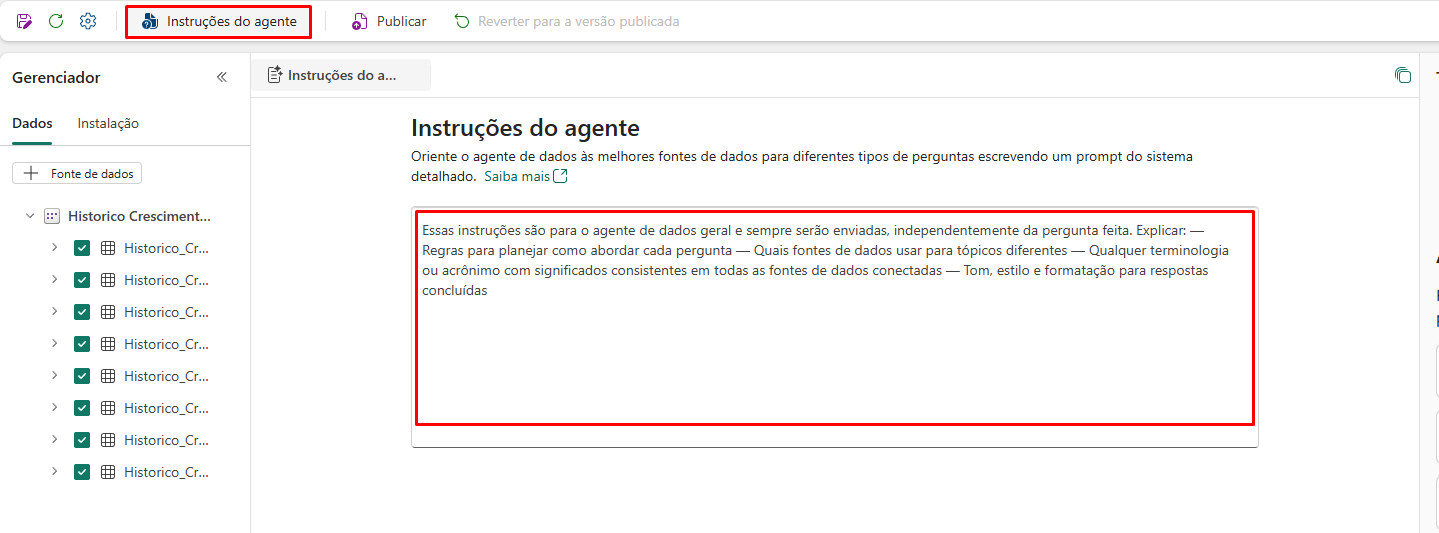 Select Data Agent Instructions to open the configuration panel.