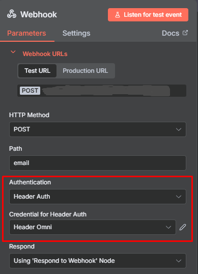 The Webhook must be configured with Header Auth so that Omni has secure access to the flow.