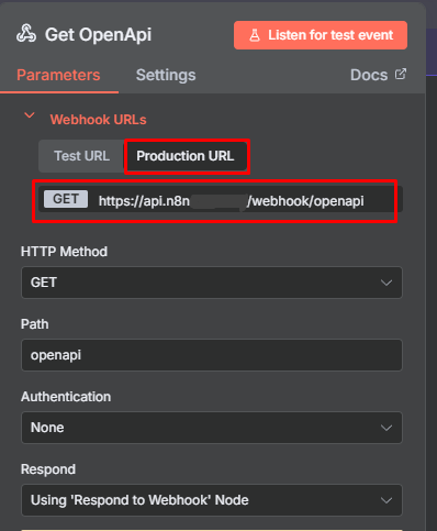 Base URL: Paste the Production URL copied from the Get OpenApi node in N8N.