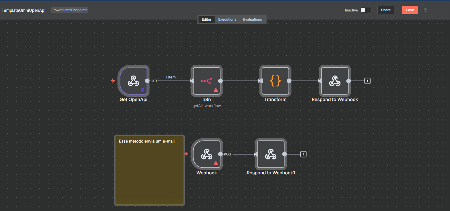 For N8N to communicate correctly with Power Omni, you must import a predefined flow template with the correct Trigger and Response structure.