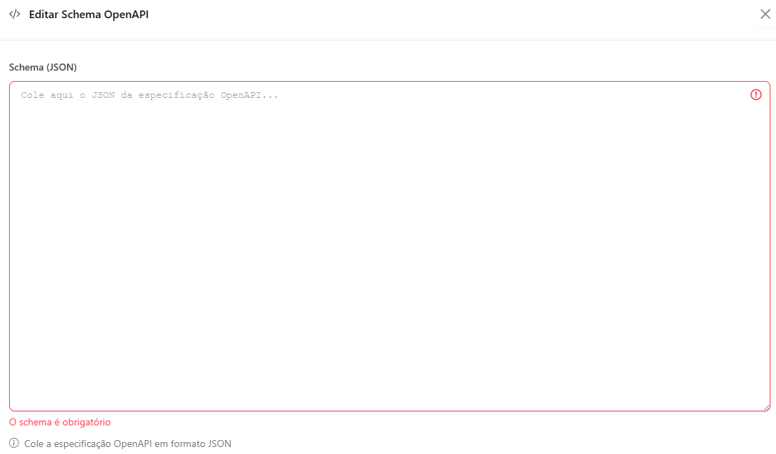Schema Editor (JSON): Area to paste the OpenAPI specification code.