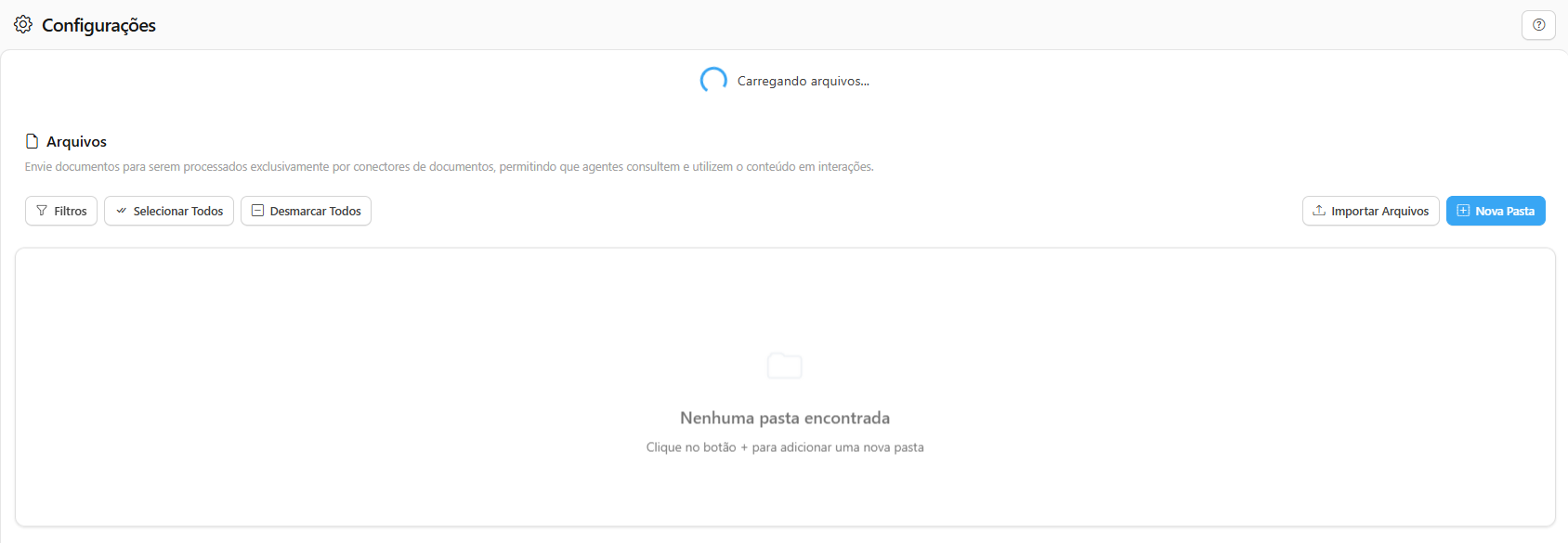 O menu Arquivos é o repositório centralizado onde você armazena e organiza os documentos que serão usados como base de conhecimento pelos seus Agentes de IA. Este é o coração da funcionalidade, garantindo que a IA responda com informações internas e específicas da sua empresa.