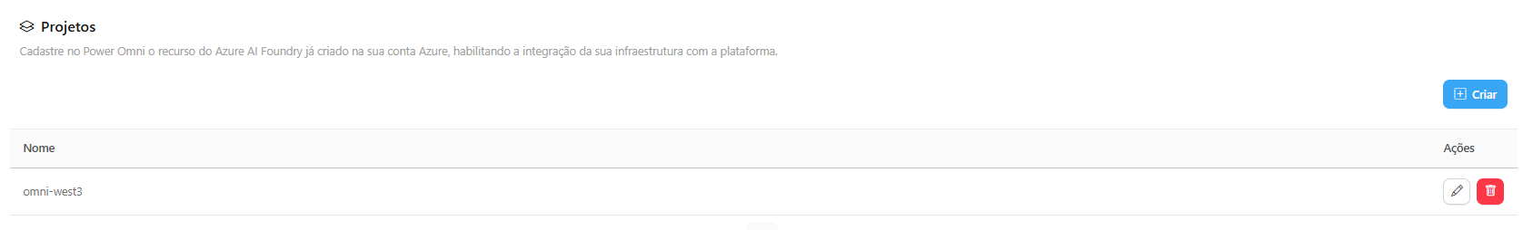 O menu Projetos é o ponto de integração entre o Power Omni e o recurso do Azure na sua conta Microsoft Azure. O cadastro de um projeto é um pré-requisito técnico para habilitar o consumo de tokens e a gestão de modelos de IA na plataforma.