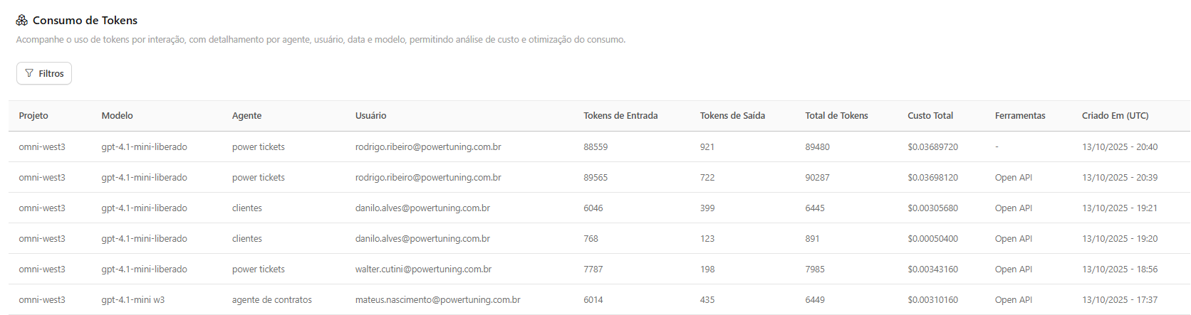 The Token Consumption menu is your data source for detailed auditing, presenting a transactional log of each AI interaction. It allows the administrator to track token costs per question, ensuring full transparency in the consumption of your Azure account.