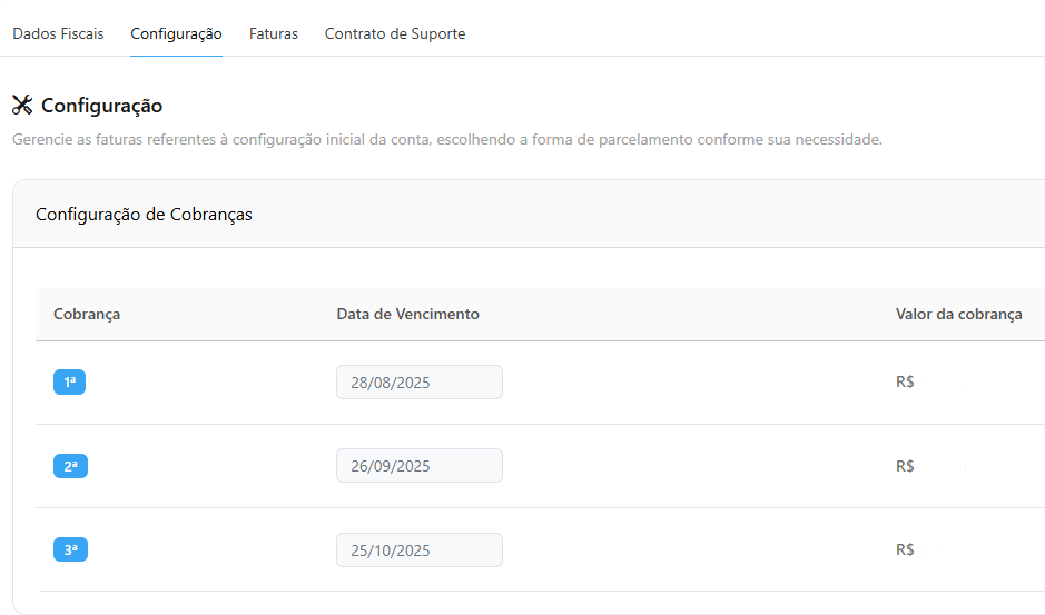 The Configuration section handles invoices related to the initial account setup, such as the onboarding fee.