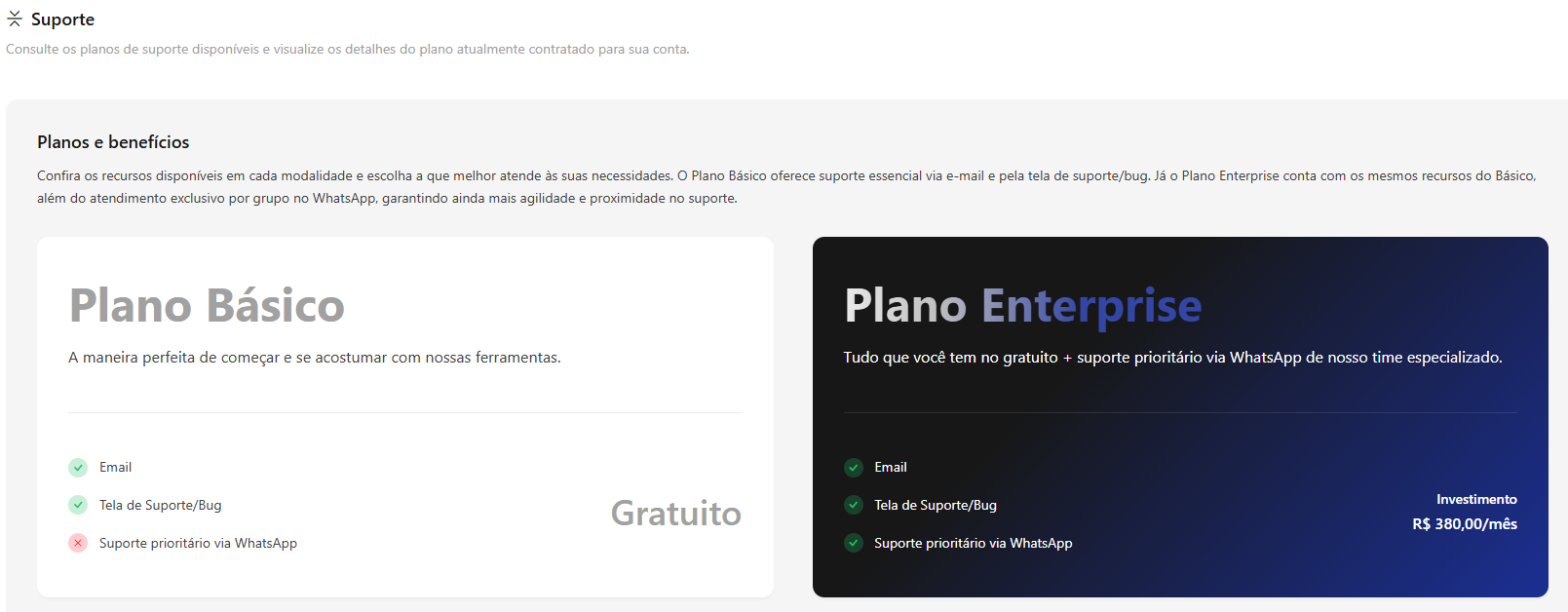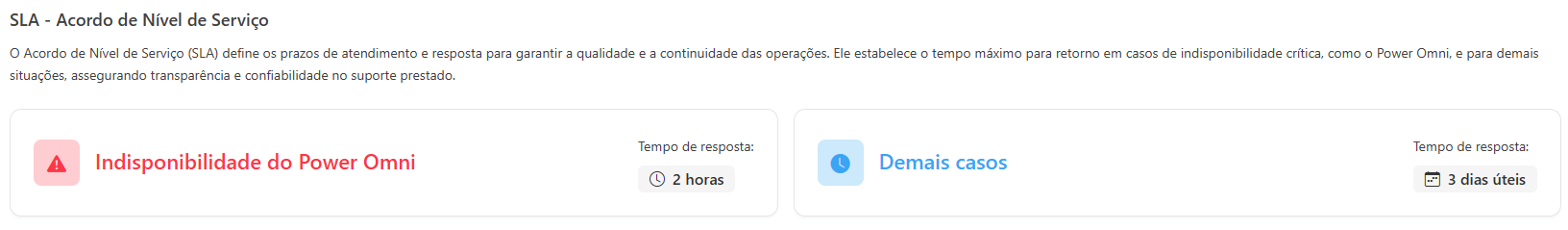 A tela de Suporte é o painel informativo onde a organização consulta os detalhes do seu nível de serviço atual e conhece as opções de planos disponíveis no Power Omni.