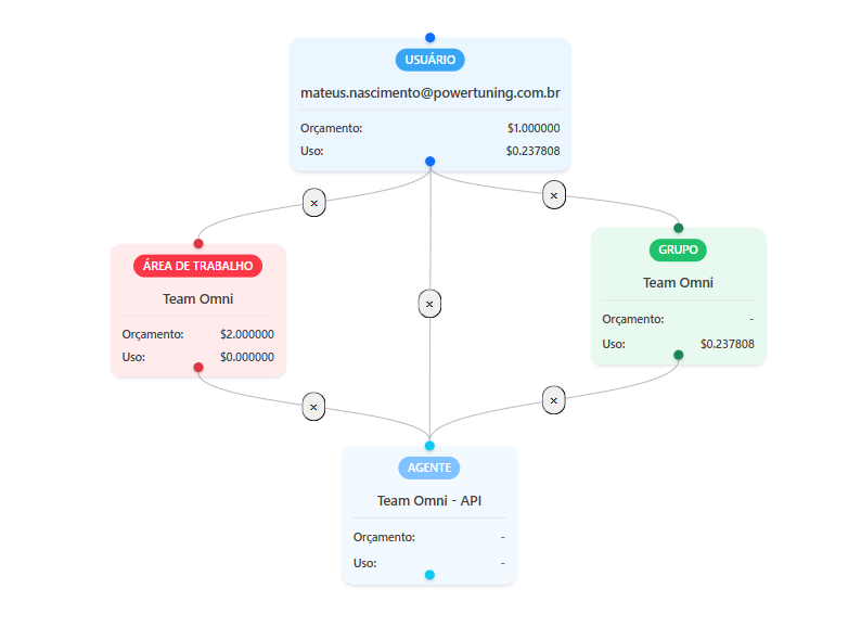 Permission Audit: In the menu Audits > View Permissions, it is possible to verify the possible paths to a specific agent and view whether there are budgets and how much usage has already been consumed in specific entities such as groups and workspaces.