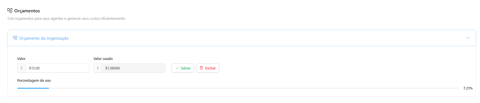 The priority order is always respected, even if one or more levels do not have a defined budget. If the Organization, User, or Agent has a budget and exceeds the limit, the system will generate a specific failure according to the level that exceeded the quota.