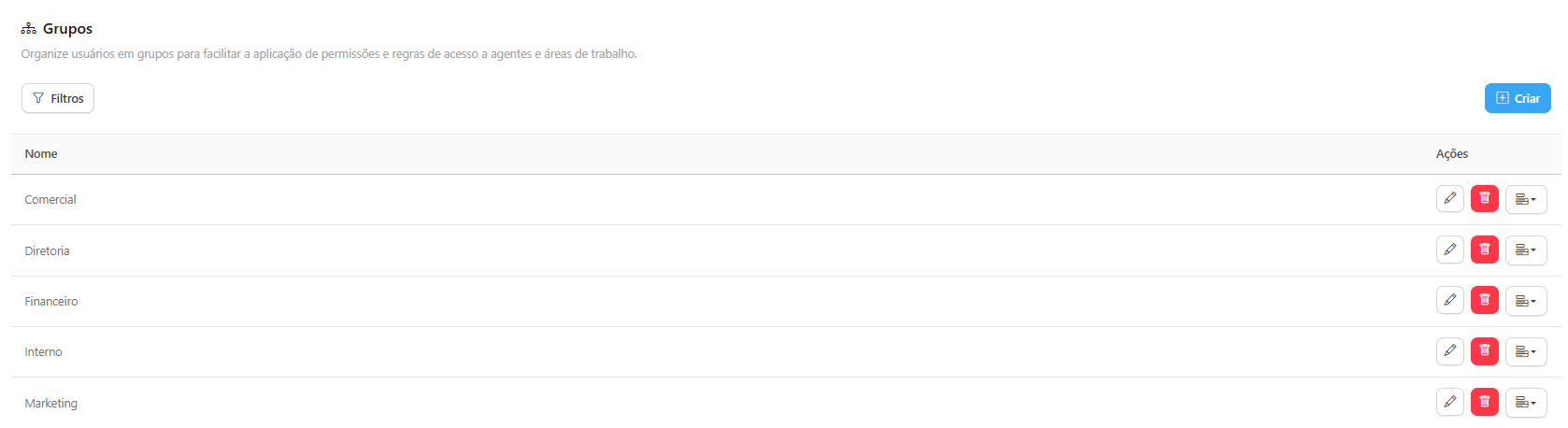 The Groups menu is the essential tool for organizing your users and simplifying the application of access rules to Agents and Workspaces. Instead of managing permissions per individual user, you manage them by Group.