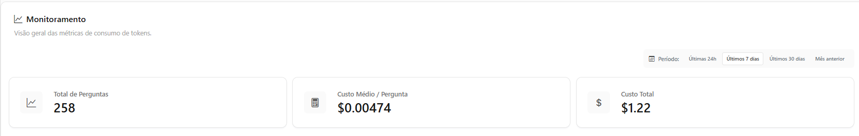 Custo Médio / Pergunta (USD): O custo médio de tokens necessário para gerar uma resposta. Ajuda a entender a eficiência do uso dos Agentes.