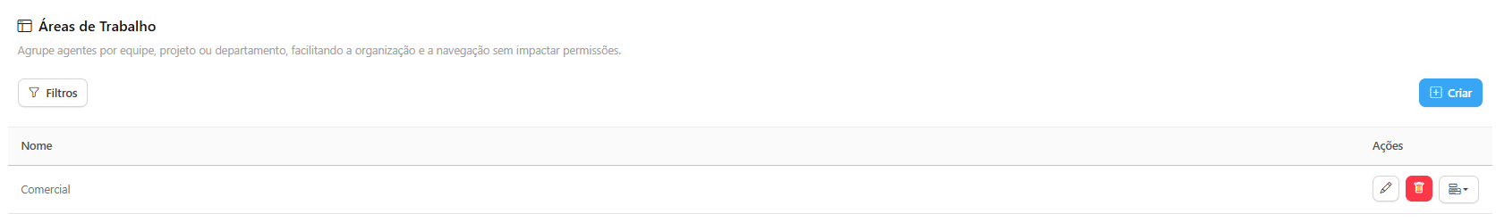 O menu Áreas de Trabalho é uma ferramenta organizacional que permite agrupar Agentes (assistentes de IA) por equipe, projeto ou departamento, facilitando a navegação e a organização do portal do usuário sem, necessariamente, impactar as permissões fundamentais.