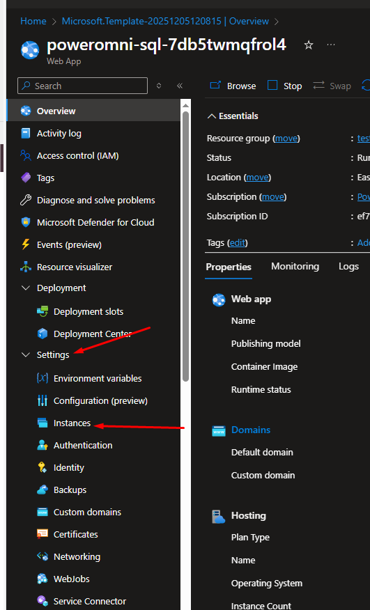 This will take you to the main page of your App Service. At this moment, it should be trying to download the docker image from the Power Tuning registry. To check the progress, go to the side menu, Settings -> Instances: