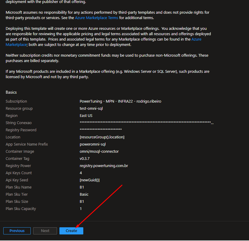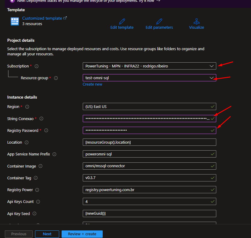 Fill in the fields: Subscription, Resource Group, Connection String and Registry Password with the information you prepared in the prerequisite.